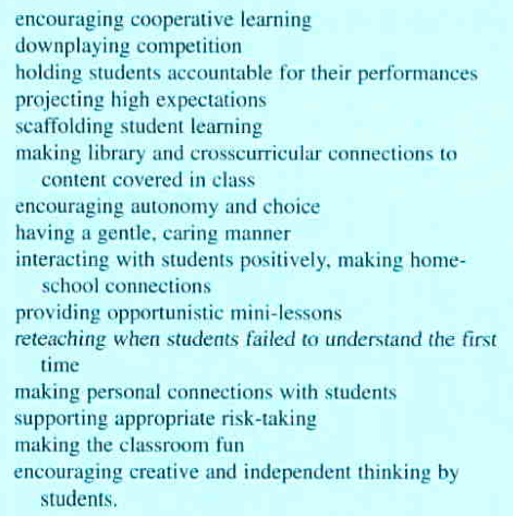 * Motivating reading and writing: teaching students to believe that they can be successful with some effort; providing rich print and reading experiences; providing holistic experiences; connecting literacy instruction with content-area learning; and encouraging cooperative learning.