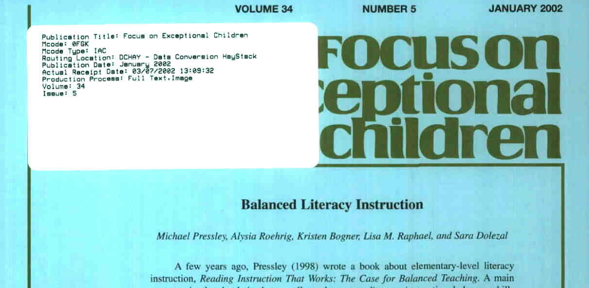 [Pressley, Roehrig, Bogner, Raphael, and Dolesal. Balanced Literacy Instruction (2002) Focus on Exceptional Children, 34(5) p. 1-16.]