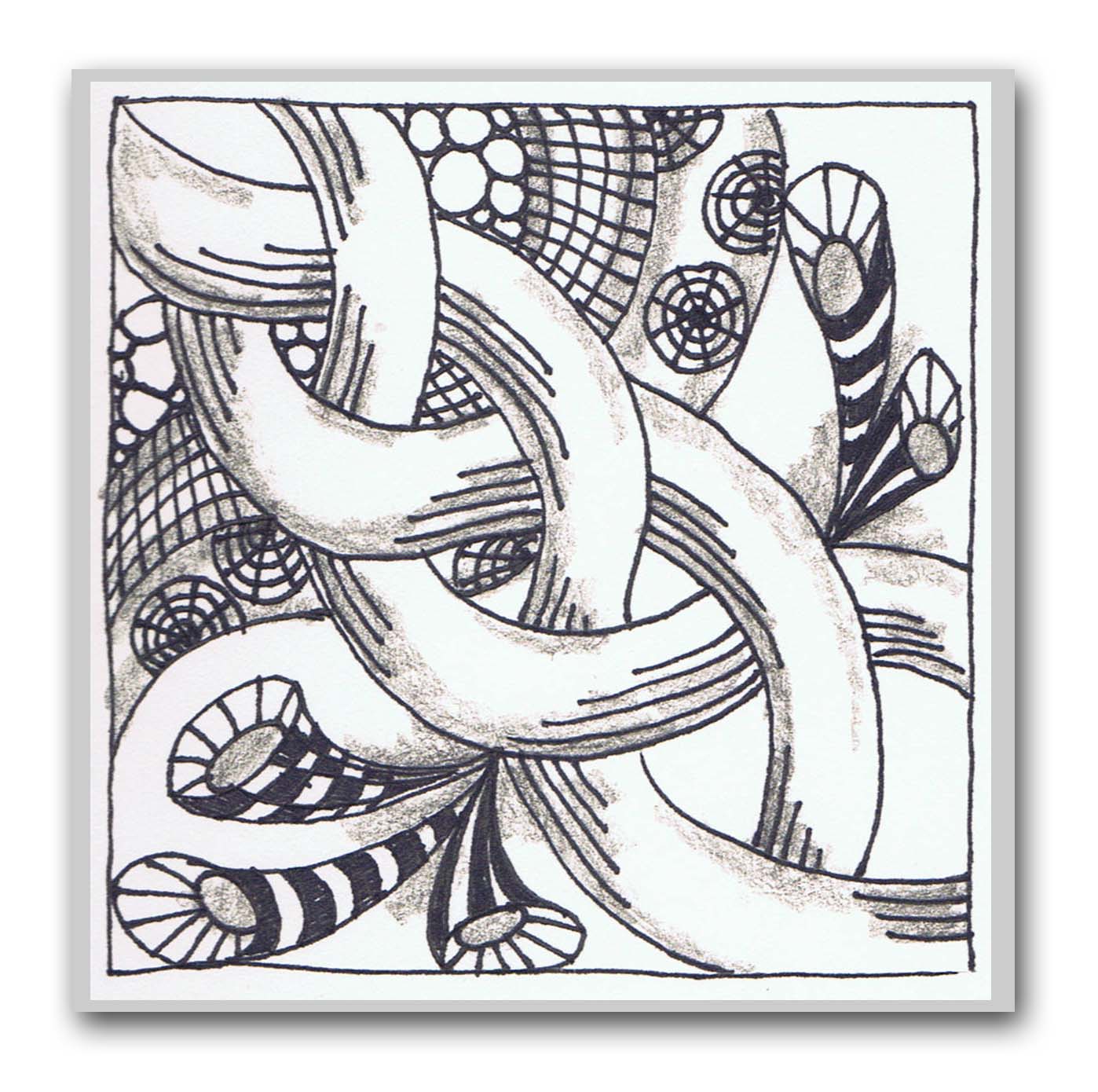 3. Start creating a tangle. A tangle is a pattern drawn in pen along the contours of the string. Your Zentangle may only have one tangle, or it could have a combination of different tangles. This pattern should be whatever naturally comes to you, remember that there is no right or wrong move when creating a Zentangle. Tangles should be composed of very simple shapes, lines, dots, squiggles. You can add pencil shading to the tangles which can create more depth and visual interest.