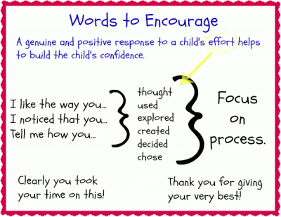 * specific positive praise, ie.” I can see that you have worked hard on your story”; rather than: “Well done, you have done exactly as I asked.”